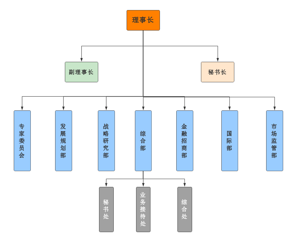 分会设理事长1名、副理事长若干名、秘书长1名、副秘书长2名及一会六部七个职能部门,即专家委员会、综合部(秘书处)、发展规划部、金融招商部、国际部、战略研究部、市场监管部。理事长负责分会的全面工作,副理事长、秘书长协助理事长工作。